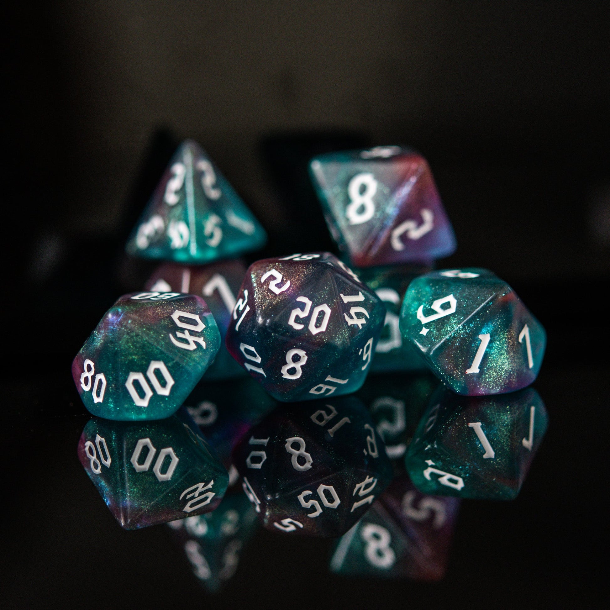 Our acrylic dice are carefully poured into individual molds and cured inside a vacuum chamber to insure no air bubbles are trapped inside the dice. After curing, each individual die is removed from the mold and numbers are painted by hand. These dice are perfect for any RPG and will sure to impress at your upcoming session!