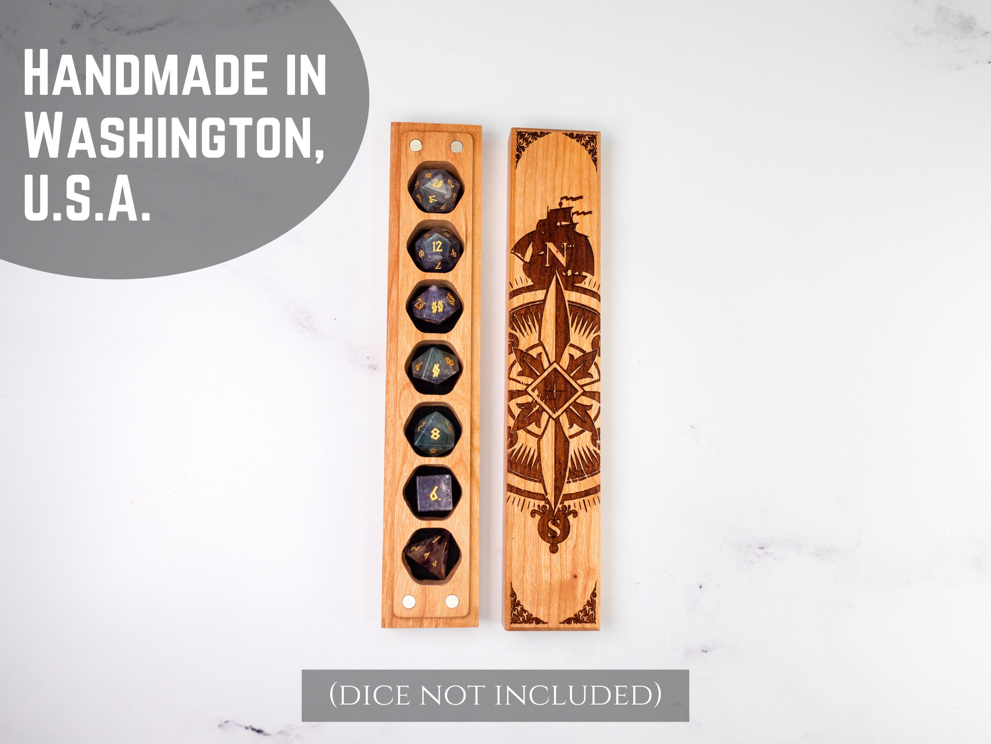 Chart your own path with Compass Rose, a timeless illustration reminiscent of an ancient cartographer’s masterpiece. Secure and travel-friendly, this dice vault anchors your collection in style, ensuring you’re always ready for your next high-seas (or high-stakes) campaign.