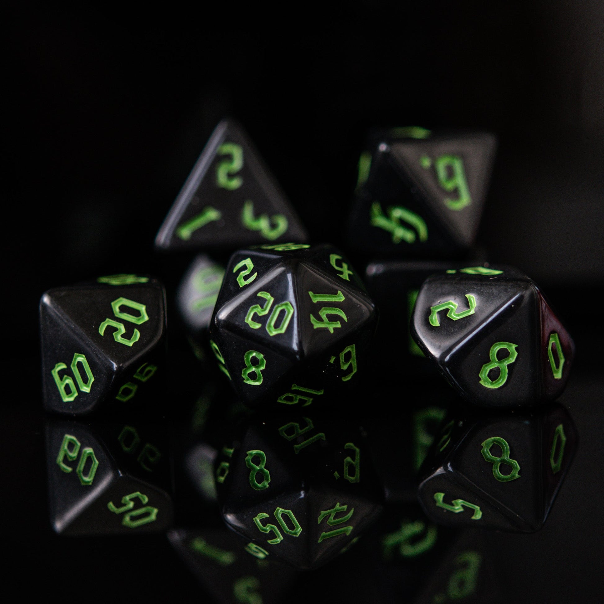 Our acrylic dice are carefully poured into individual molds and cured inside a vacuum chamber to insure no air bubbles are trapped inside the dice. After curing, each individual die is removed from the mold and numbers are painted by hand. These dice are perfect for any RPG and will sure to impress at your upcoming session!