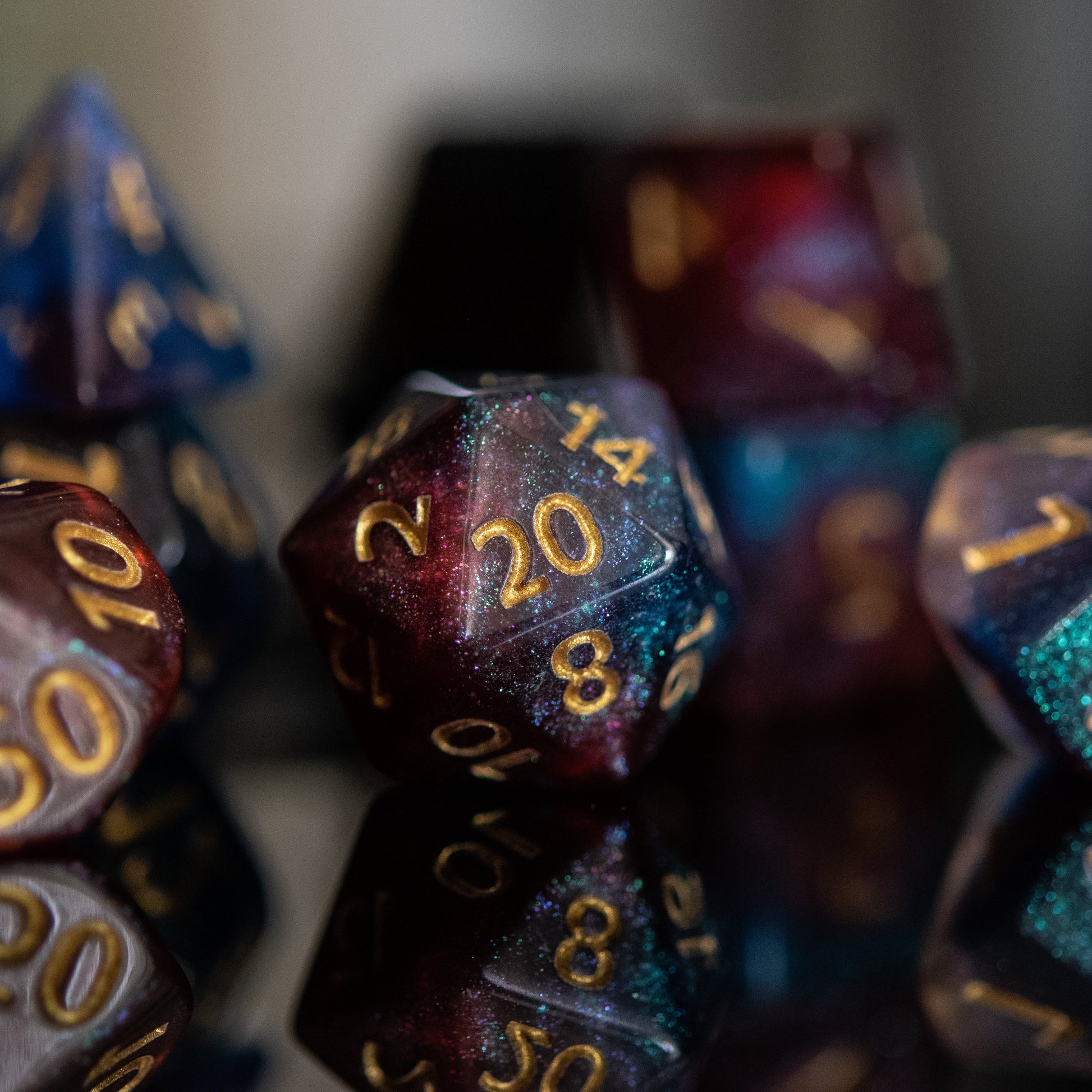 Our acrylic dice are carefully poured into individual molds and cured inside a vacuum chamber to insure no air bubbles are trapped inside the dice. After curing, each individual die is removed from the mold and numbers are painted by hand. These dice are perfect for any RPG and will sure to impress at your upcoming session!