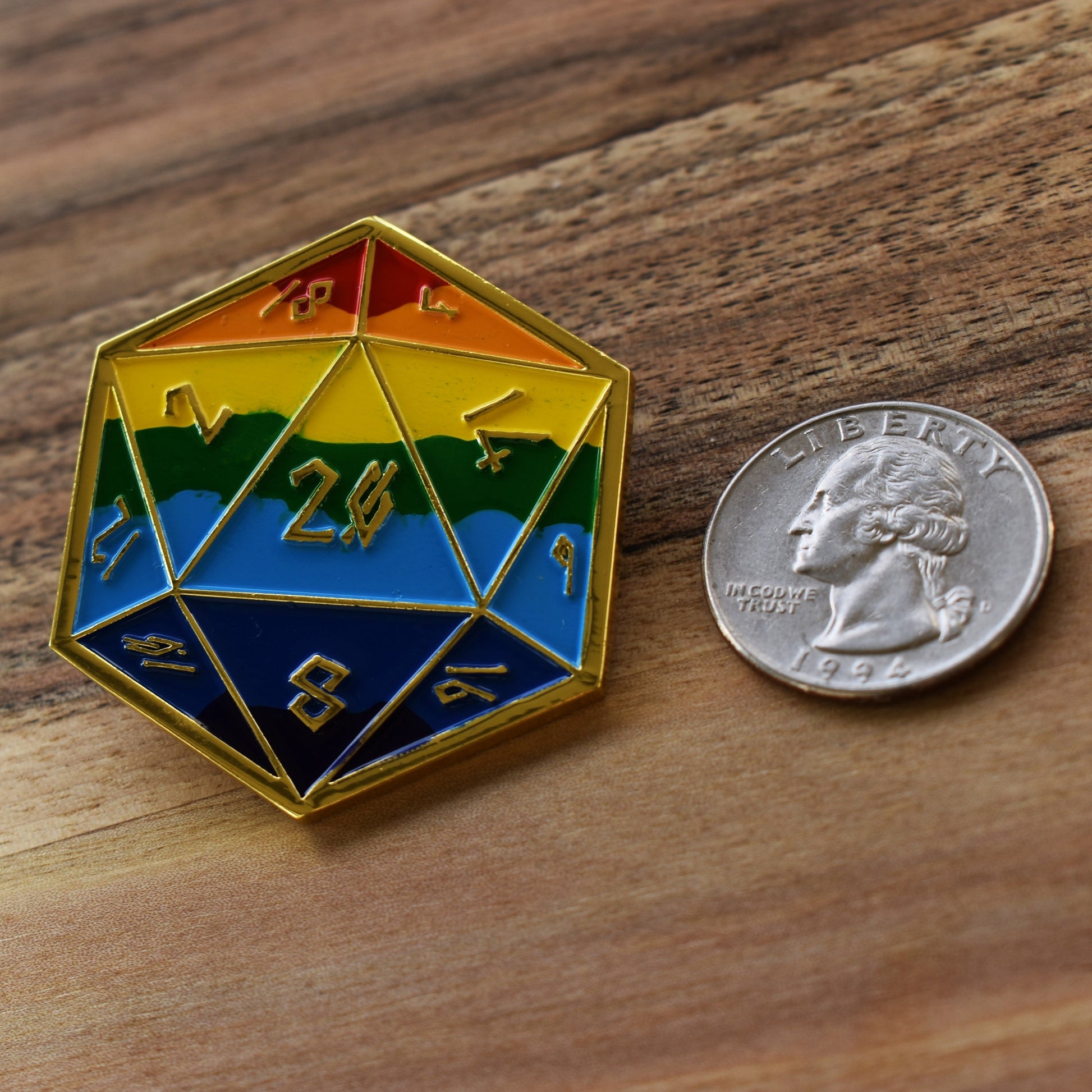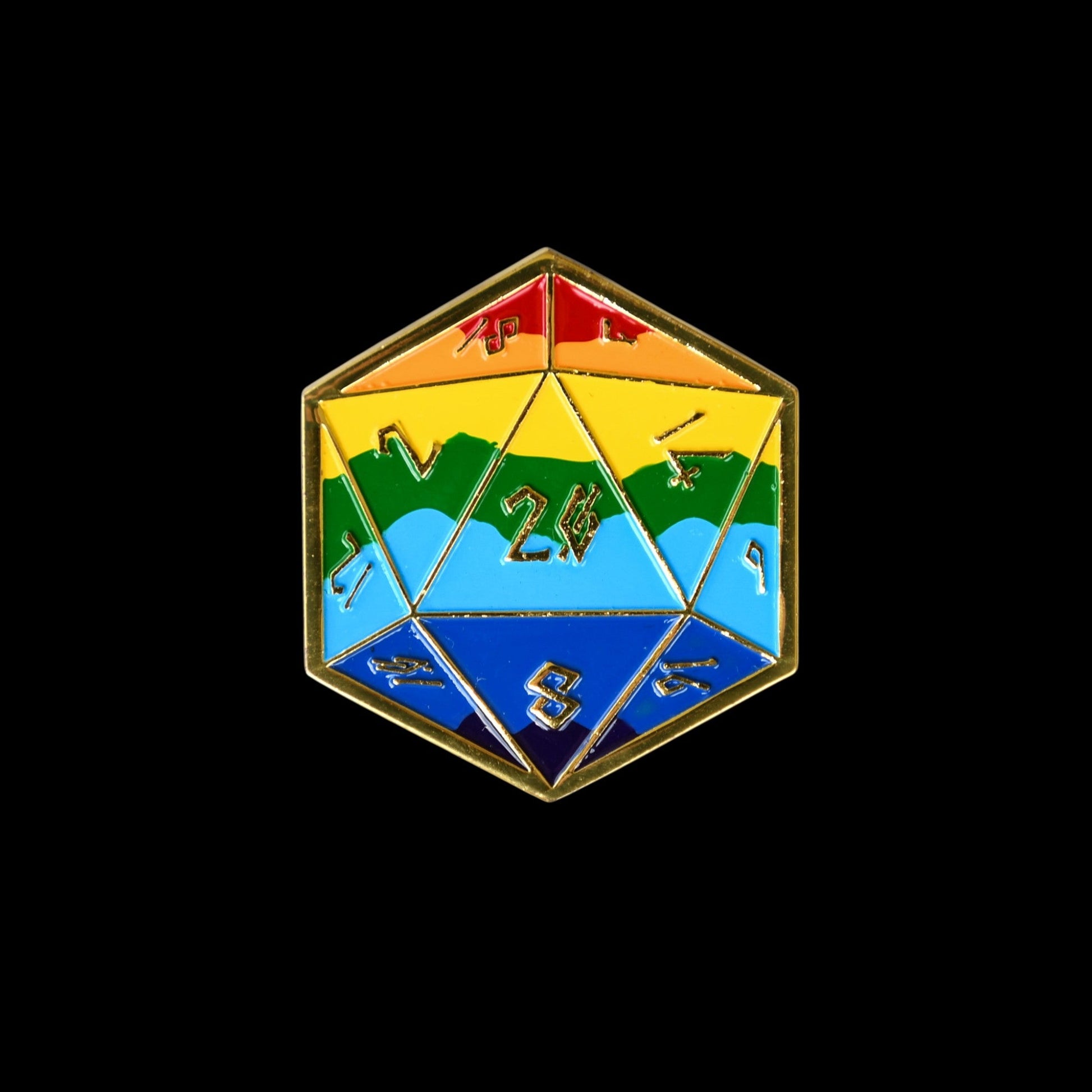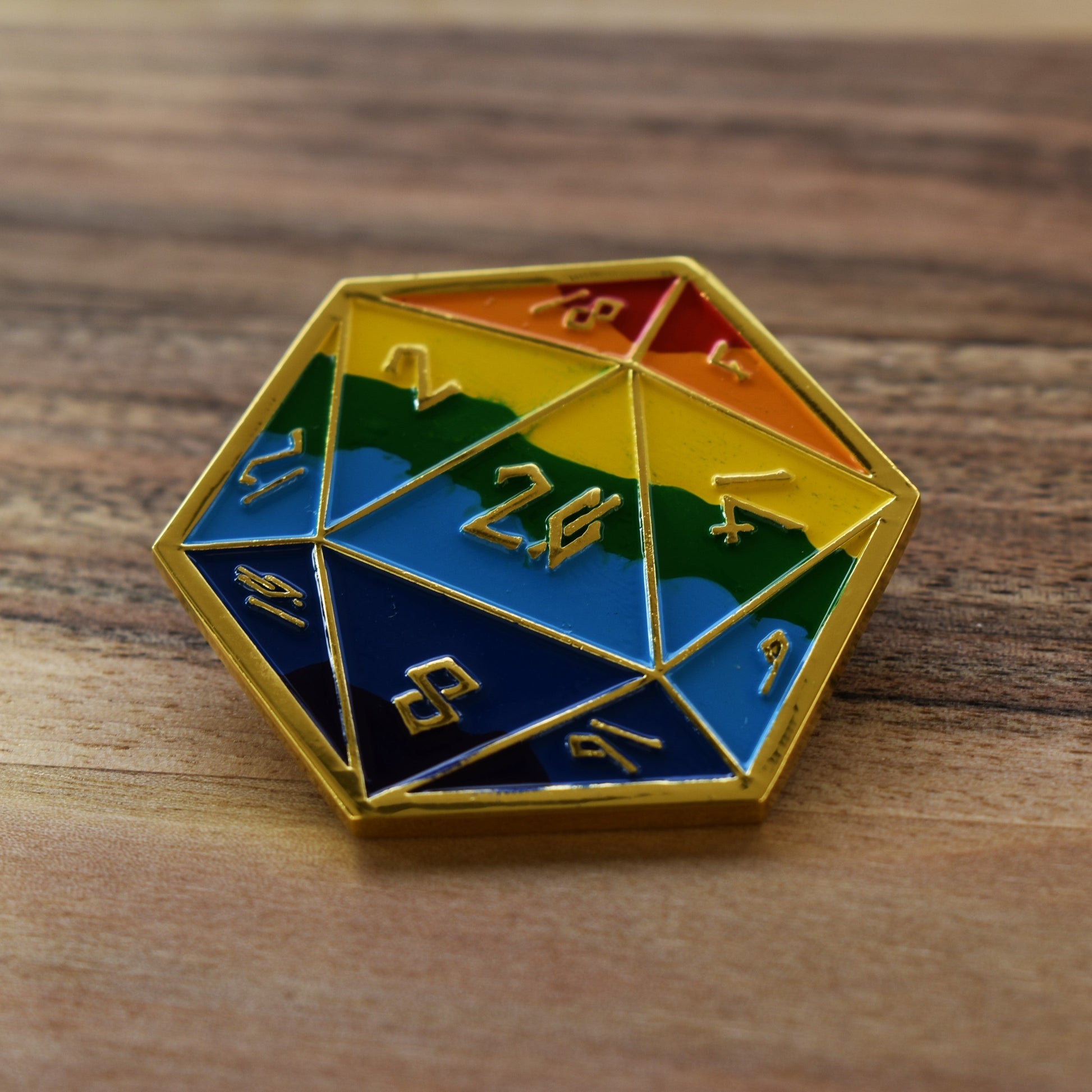 This pin is perfect for bags, shirts, caps, etc.! Featuring a custom design and font to match our Elder Runes Pride and Gold Metal Dice.