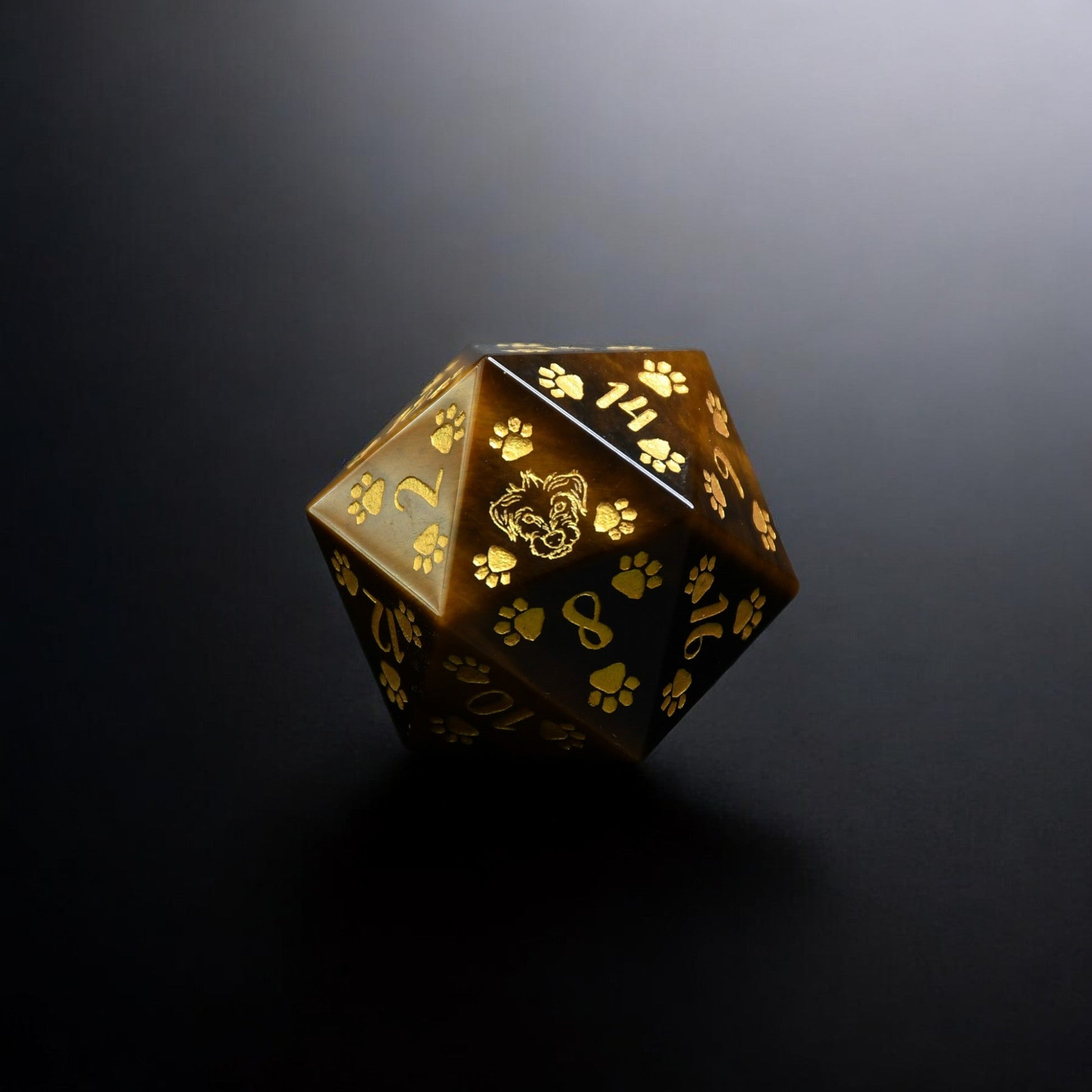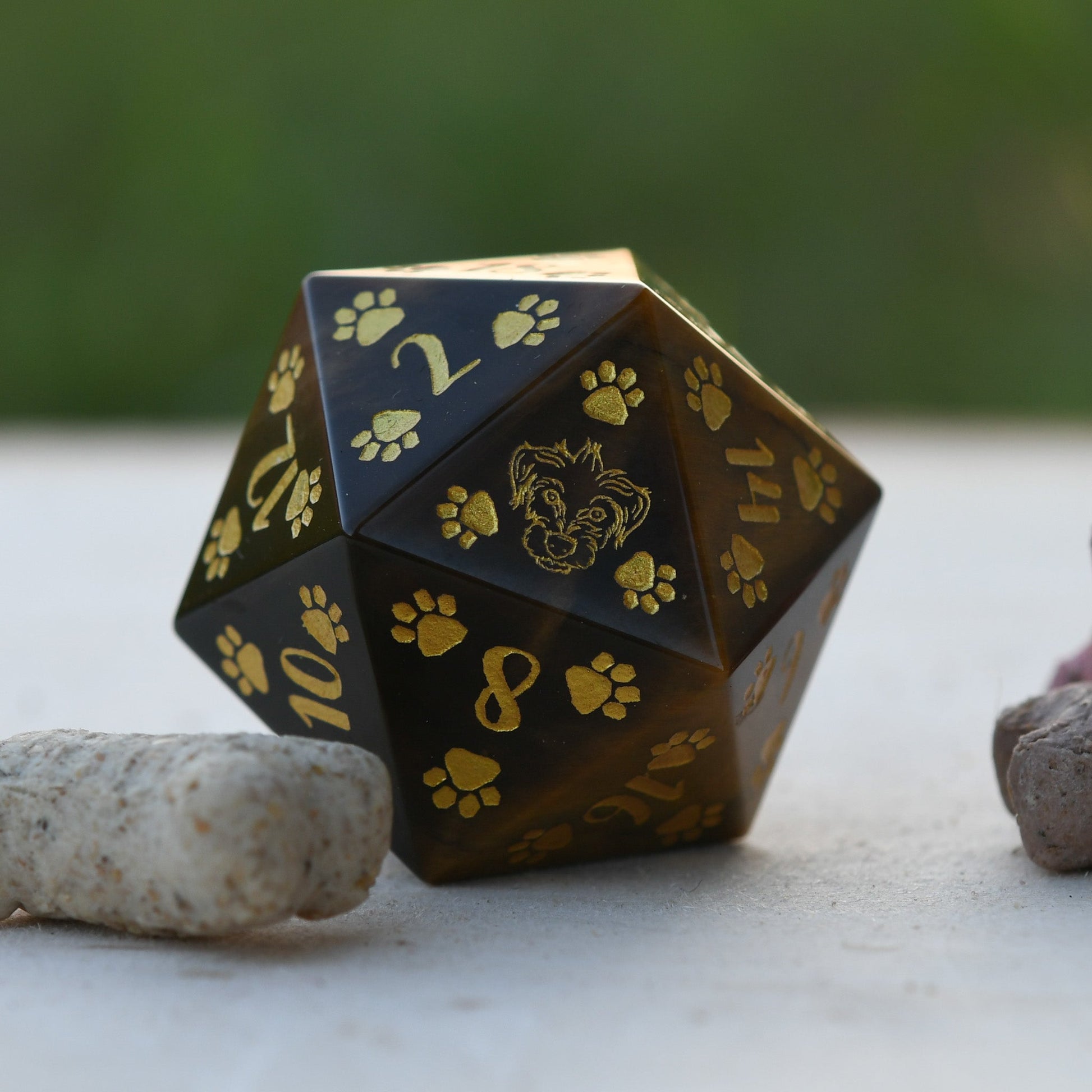 Every D20 is hand carved from gemstone. Designs are then engraved into each side and hand painted. Gemstone dice are never guaranteed to have a perfectly balanced weight; however, each of our dice sets are always well weighted and well balanced.