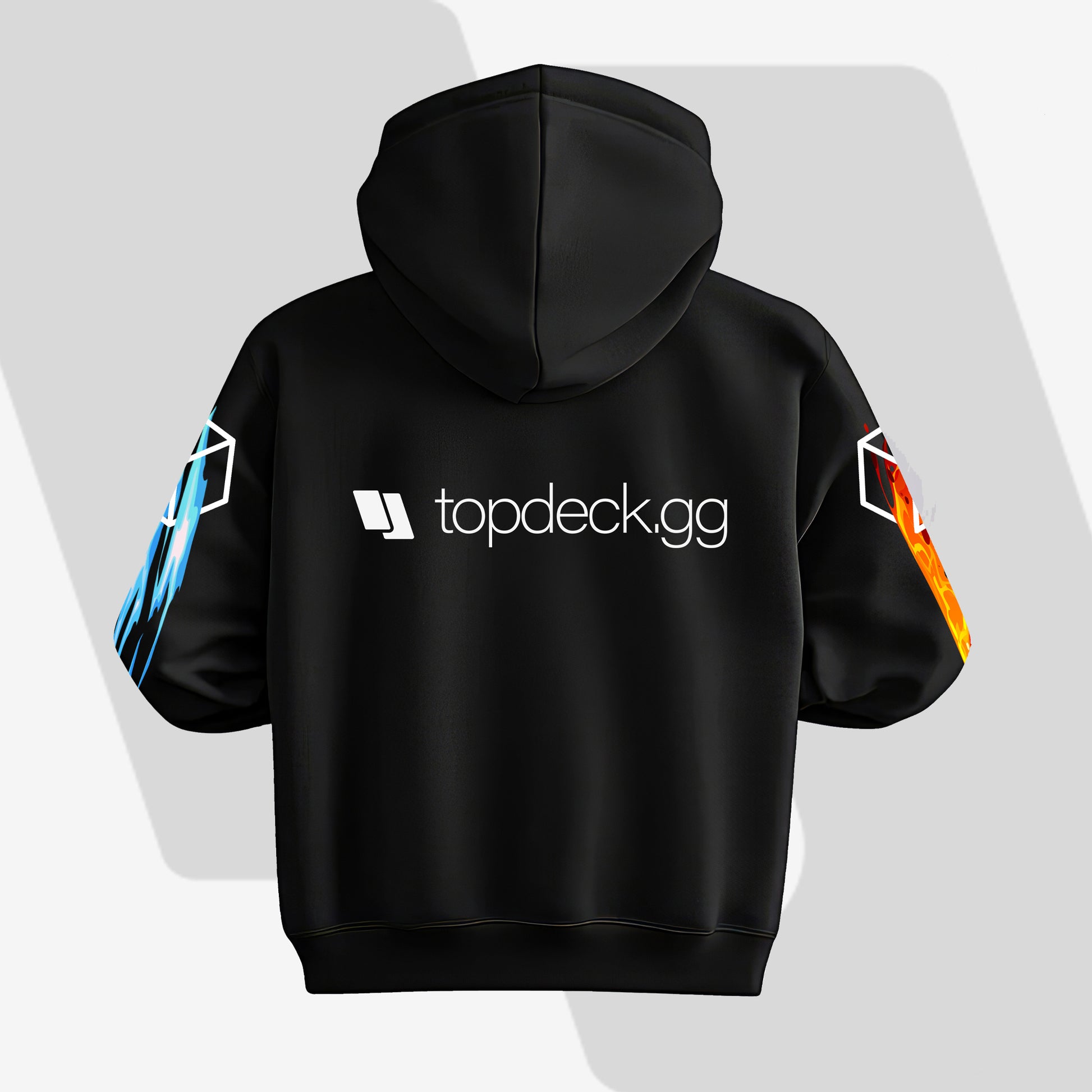 Turn up the heat and ride the wave with the TopDeck.gg Ignite & Flow Hoodie - a bold, dynamic design inspired by the passion and balance of the Trading Card Game (TCG) community. Featuring striking fire and water elements across the sleeves and the iconic TopDeck.gg emblem blazing on the chest, this hoodie is made for players who bring energy and style to every match.