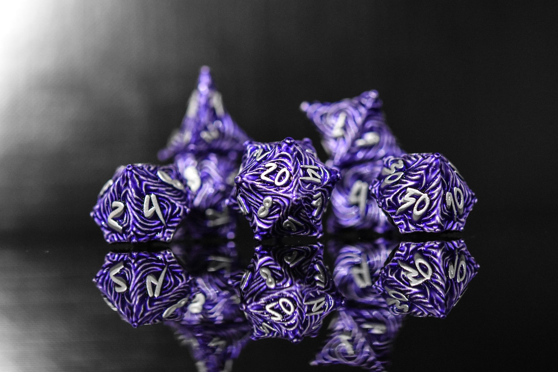 Our metal dice sets are all cast from zinc alloy metal to assure better balanced rolls. This set is perfect for any RPG and will be sure to impress at your upcoming session! Every set comes with its own metal dice tin for easy storage and a winning presentation.