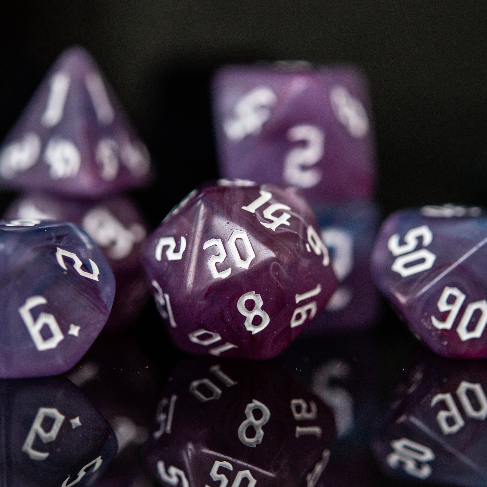 Our acrylic dice are carefully poured into individual molds and cured inside a vacuum chamber to insure no air bubbles are trapped inside the dice. After curing, each individual die is removed from the mold and numbers are painted by hand. These dice are perfect for any RPG and will sure to impress at your upcoming session!